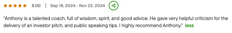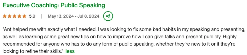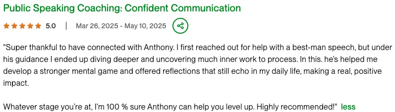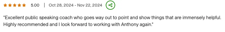 A skilled public speaking coach with expertise in executive communication and keynote presentation development. Successfully coached clients to enhance their speaking skills, elevate executive presence, and craft impactful speeches Proficient in vocal delivery techniques, speech writing, and presentation coaching, driving improved audience engagement and impactful messaging. Utilizes advanced communication strategies to help clients become memorable speakers and effectively convey their messages in various professional contexts.